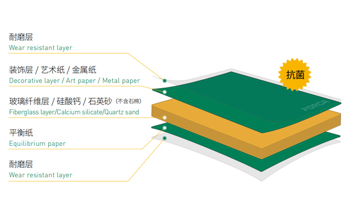 • 福爾卡?醫(yī)耐板?(玻纖復合不燃板)是由耐磨層、裝飾層、玻璃纖維層、硅酸鈣、石英砂(不含石棉)和平衡紙,表面經(jīng)過三聚氰胺樹脂與特種改性樹脂浸漬層疊后高溫高壓而成,產(chǎn)品的密度不低于1650KG/m3,厚度從4mm 到12mm,形成了整體A級防火、密度高、硬度高、表面毛孔很小的纖維板。